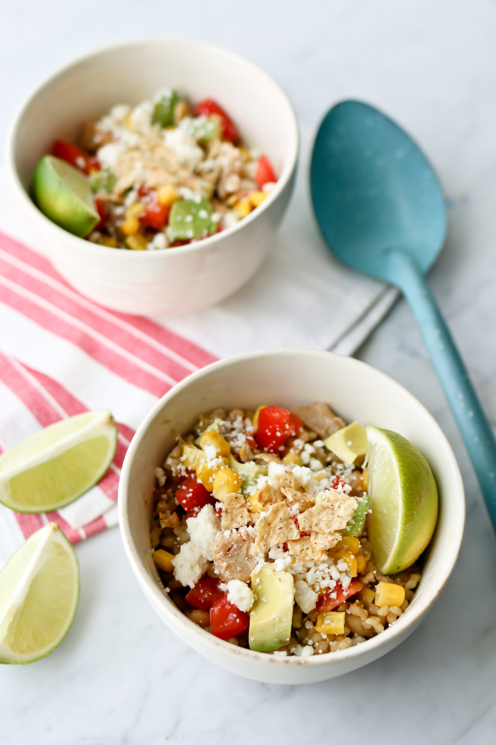 This Green Chile Chicken and Rice is a one-pot meal and is just begging to be topped with all your favorite toppings. Juicy bites of chicken mixed into creamy brown rice, amped with bright salsa verde flavors — there won’t be a resistant eater in the whole house! Top it with cheese, fresh tomatoes, avocado, and a big dollop of sour cream. Bonus: The leftovers the next day are even better!