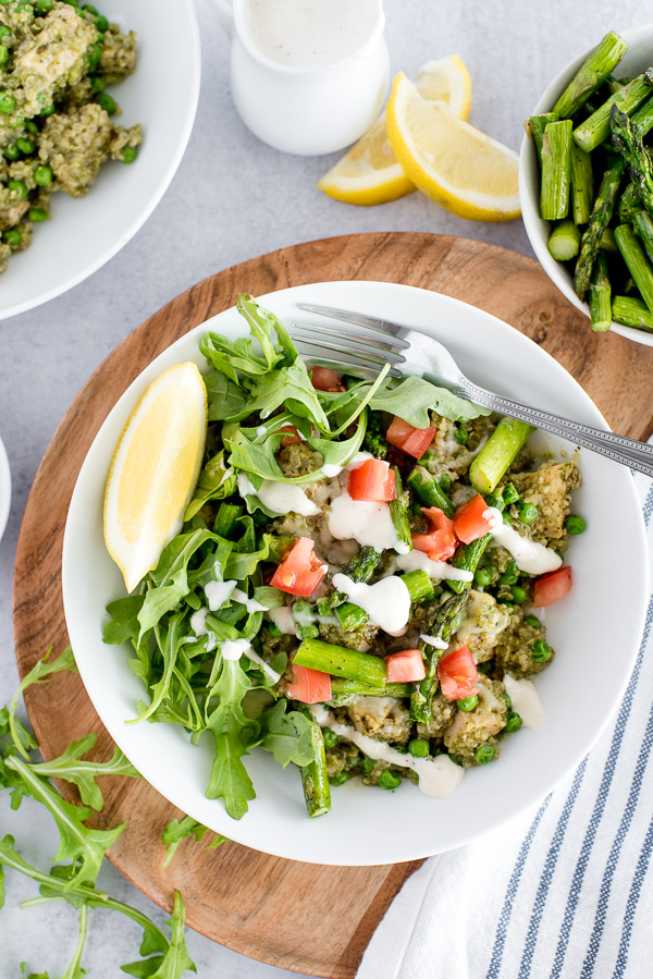 One pot Pesto Chicken and Rice – the meanest, greenest, most amazing dinner to ever grace your table. Bright with herbaceous and lemon flavors, this is the perfect easy weeknight meal. Lay out the toppings and let everyone build their own bowl!